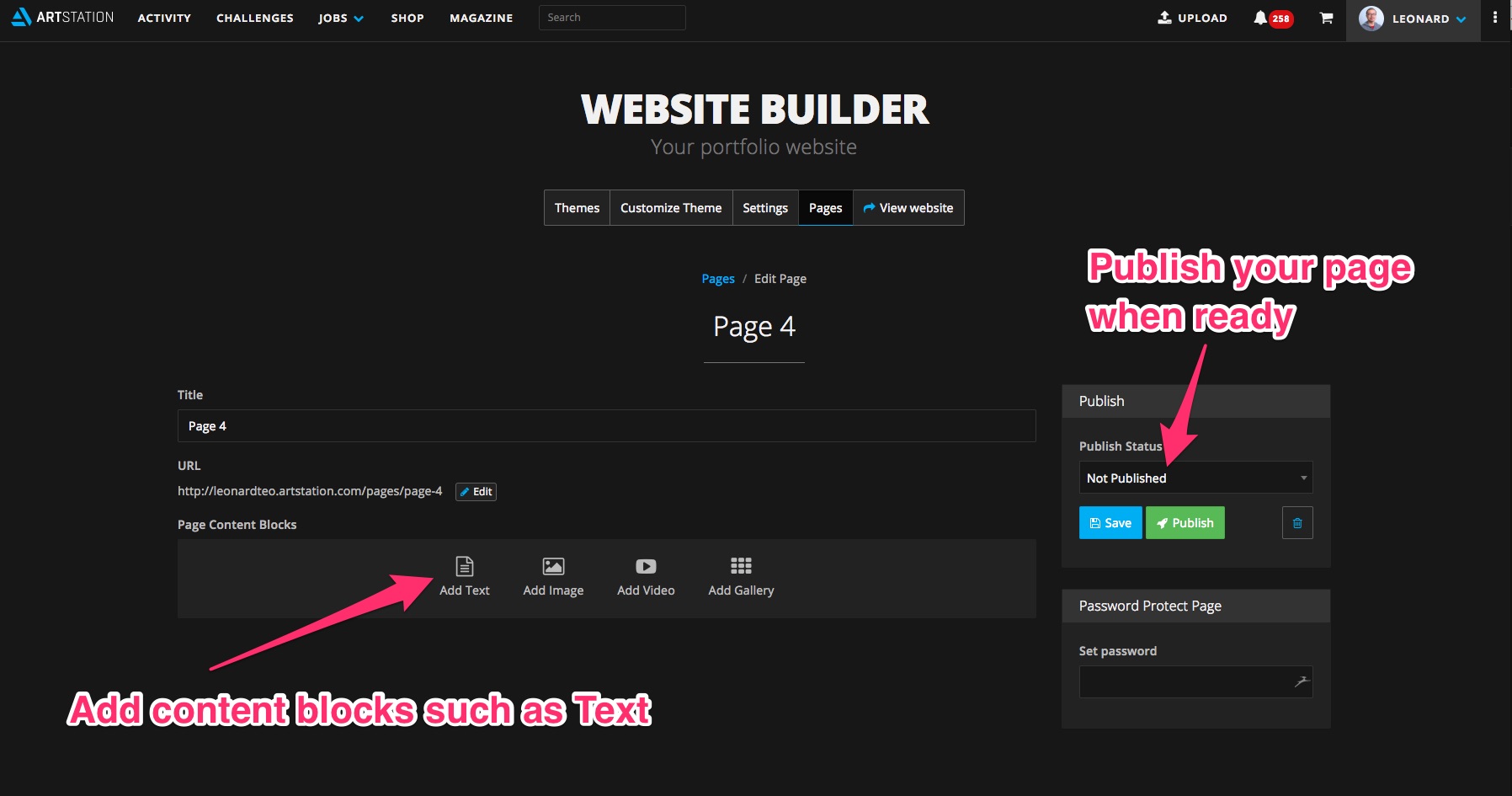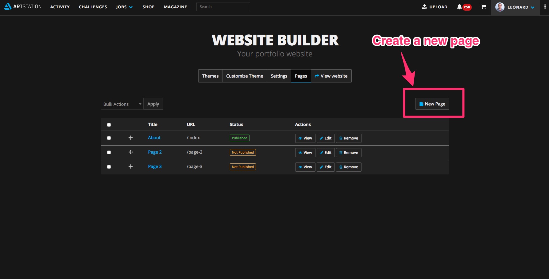 On your ArtStation powered website, you can create static pages. In your Website Builder, click on "Pages" to access the Page Management section.